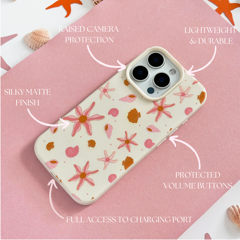 The Peachy Beach Phone Case brings all the dreamy coastal vibes with a sprinkle of seashells, soft coral tones, and whimsical starfish. Featuring a sweet blend of peachy pinks, sandy hues, and ocean-inspired charm, this case is perfect for beach lovers and daydreamers alike.