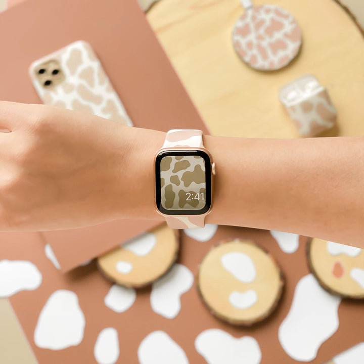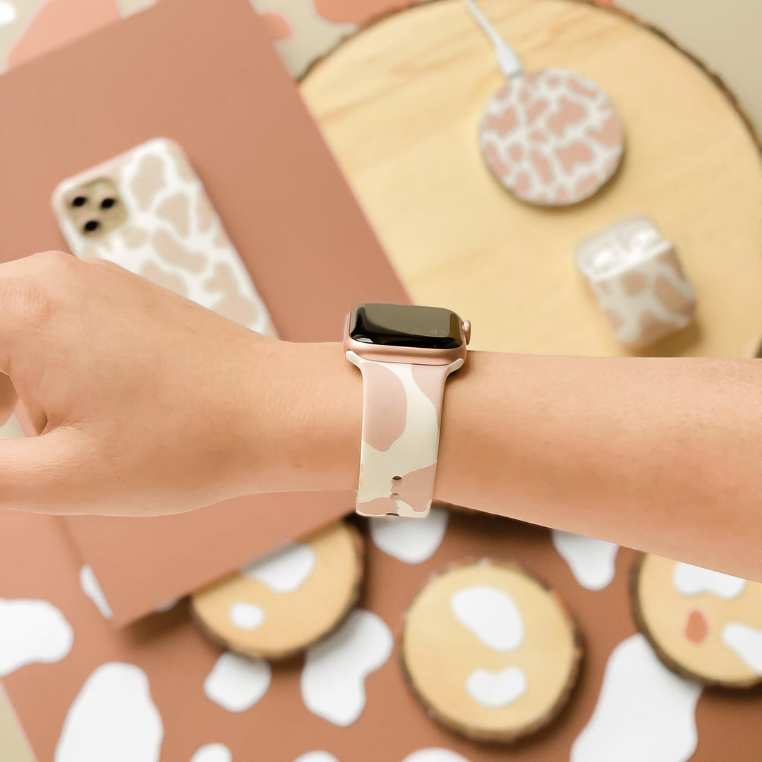 A person wearing a Coconut Lane Nude Cow Apple Watch Strap with a beige and white patterned band. The background exudes matching vibes, featuring various tech accessories like a phone case, wireless charger, and AirPods case in the same pattern on a light wooden surface. The silicone finish adds a modern touch.