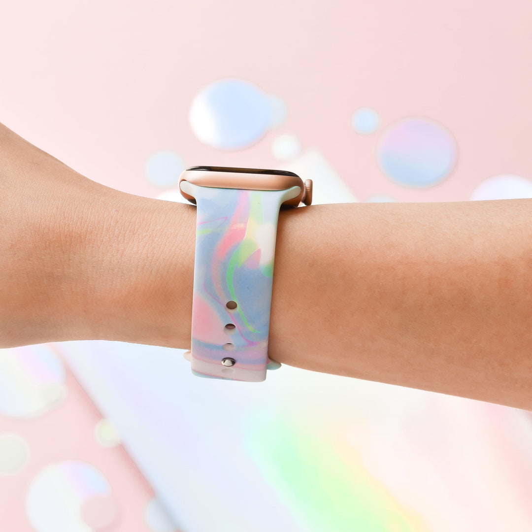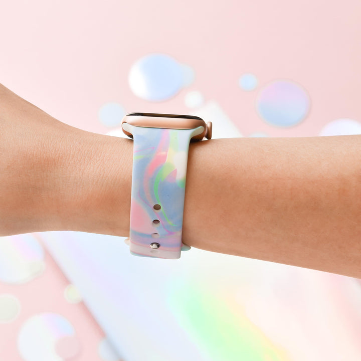 A close-up image of a person's arm wearing an Apple Watch paired with the Coconut Lane Holo Bubble Apple Watch Strap, showcasing its multi-colored, pastel gradient. The background is a soft pink with blurred circular reflections that create a dreamy, abstract atmosphere, perfectly accentuating the strap's holographic iridescent design.