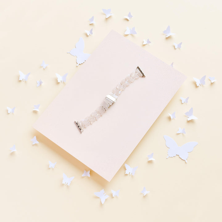 A hand is shown wearing the Luxe Holo Butterfly Apple Watch Strap by Coconut Lane, featuring a light-colored, decorative design. The background showcases cut-out white butterfly shapes scattered on a neutral surface, creating a delicate and whimsical atmosphere.