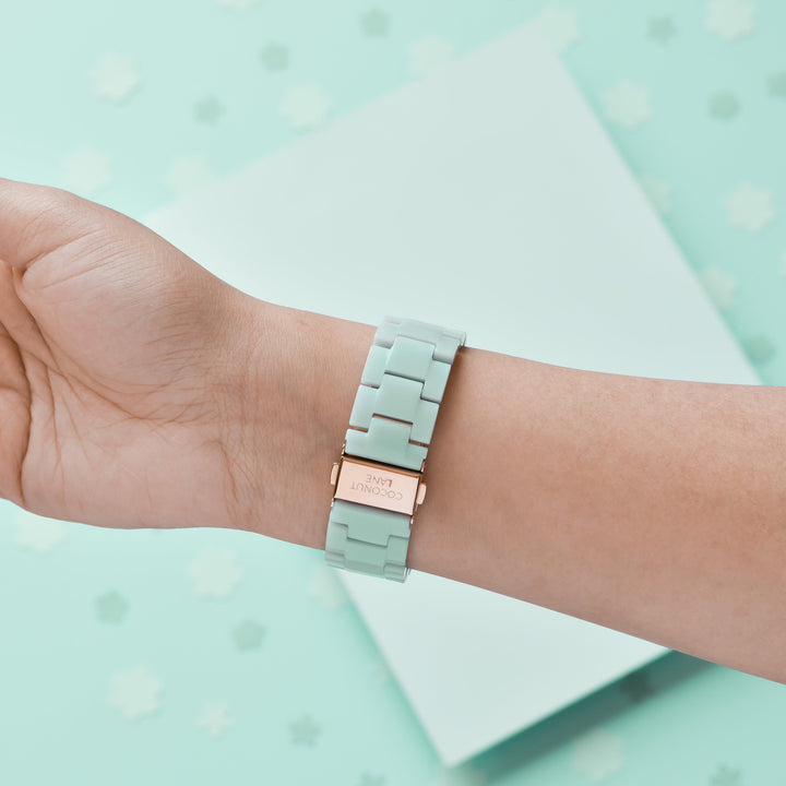 A hand wearing a Coconut Lane Luxe Pastel Mint Apple Watch Strap, featuring a rose gold clasp, is set against a mint green background adorned with small white floral shapes. The watch has an adjustable, linked strap, creating a harmonious and aesthetically pleasing scene.